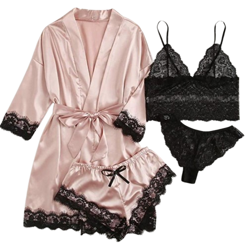 A four-piece satin pajamas set including a nightgown, suspenders, underwear, and shorts, with lace stitching that makes you look sexy.